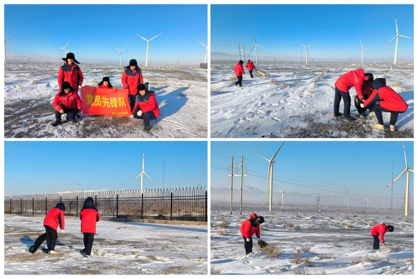 同一時(shí)間,公司第三黨支部也在達(dá)坂城風(fēng)電場(chǎng)區(qū)域開展志愿勞動(dòng)活動(dòng)。大家在完成機(jī)組運(yùn)維工作的間隙,主動(dòng)拿起工具,清理場(chǎng)站周邊道路及公共區(qū)域的垃圾。大家不畏嚴(yán)寒,以高度的責(zé)任感和團(tuán)隊(duì)協(xié)作精神,迅速投入到垃圾清撿工作中,對(duì)角落及設(shè)備周邊的垃圾進(jìn)行細(xì)致清理,確保每一處通道都安全暢通,每一臺(tái)設(shè)備都能正常運(yùn)行。忙碌的身影在場(chǎng)站中穿梭,與遠(yuǎn)處旋轉(zhuǎn)的風(fēng)機(jī)遙相呼應(yīng),共同構(gòu)成了一幅冬日里充滿溫情與力量的畫卷。