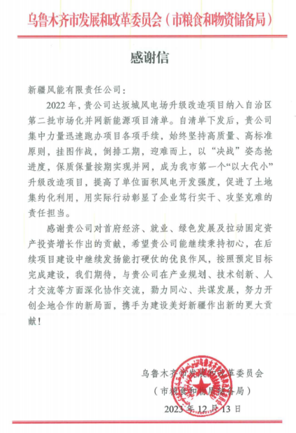新疆風(fēng)能有限責(zé)任公司達(dá)坂城升級(jí) 改造項(xiàng)目喜獲感謝信